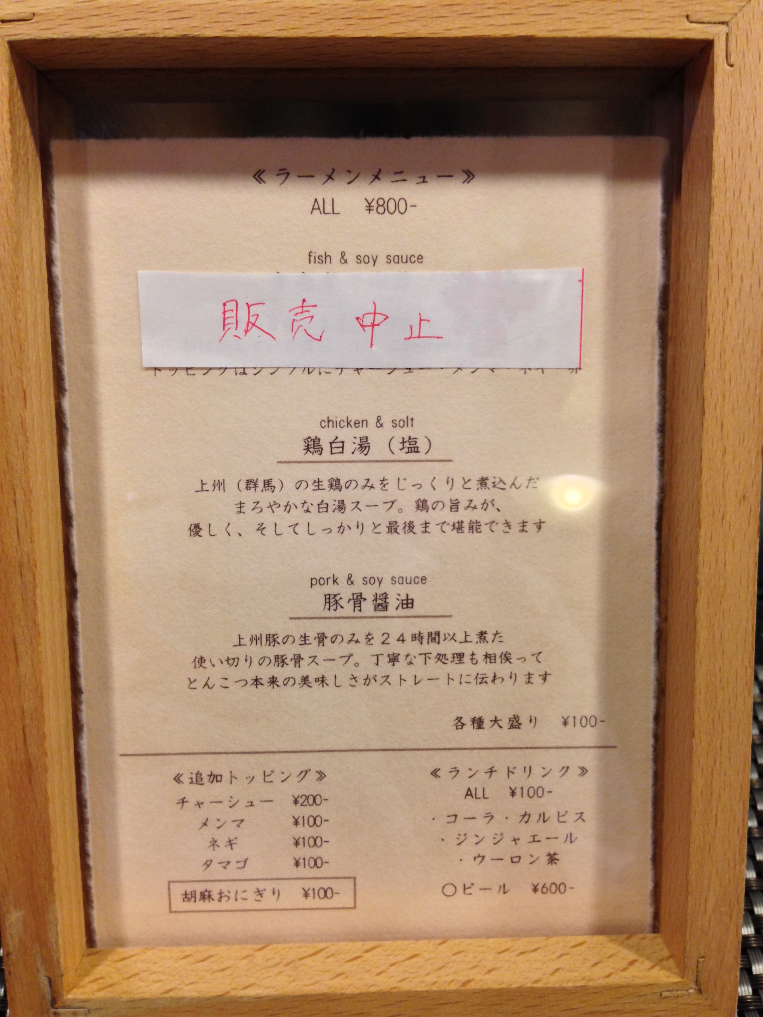 | トッピング内容 | 白髪ネギ、水菜、メンマ、茹で玉子半分、チャーシュー1枚 |