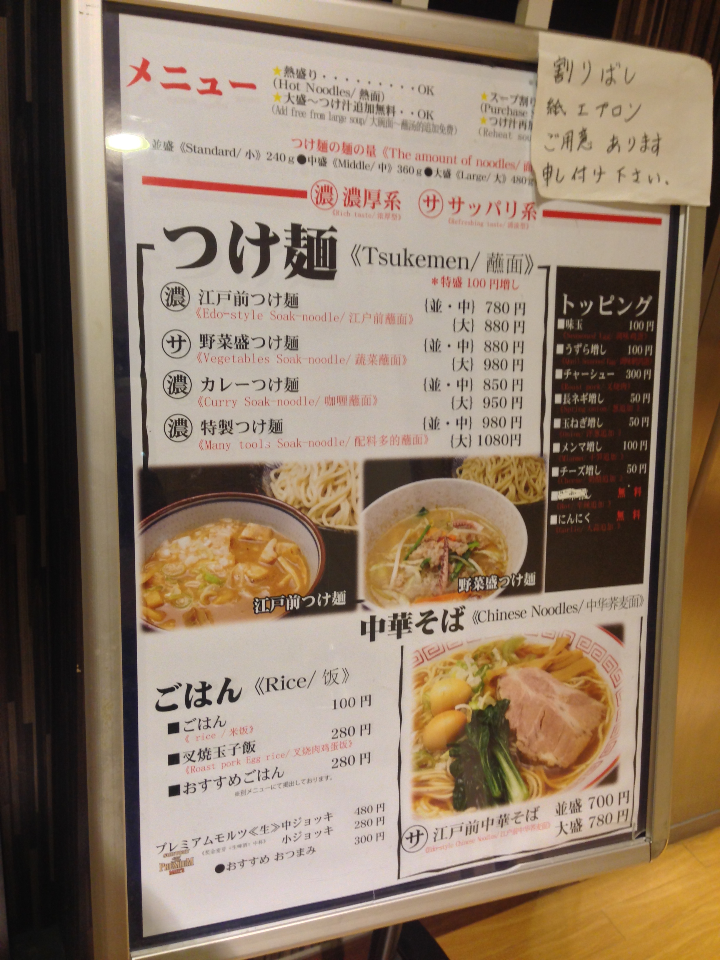 メニューは江戸前つけ麺、野菜盛つけ麺、カレーつけ麺、江戸前中華そば、特製つけ麺。