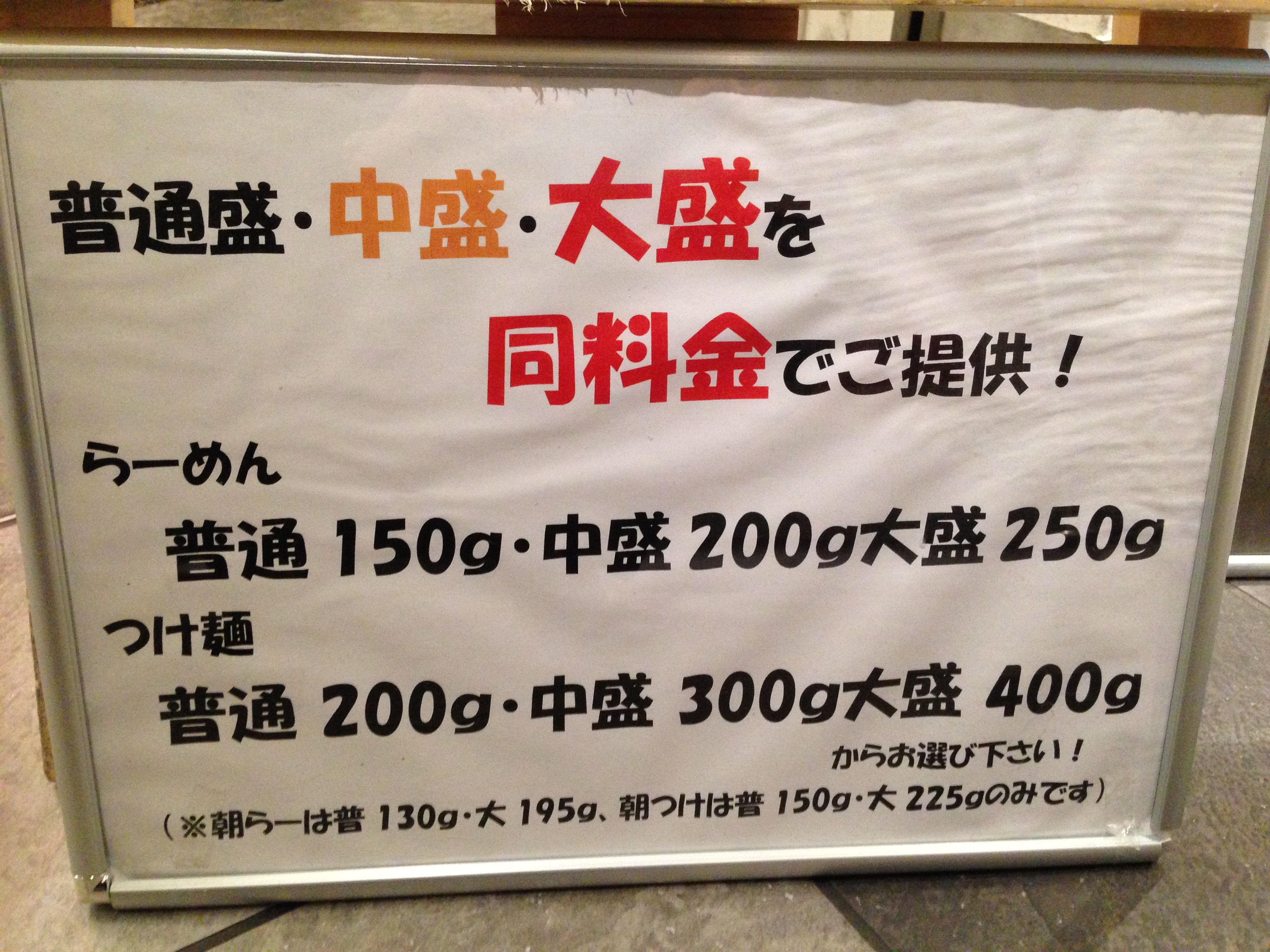 らーめんは普通盛150g、中盛200g、大盛250gが同一価格。